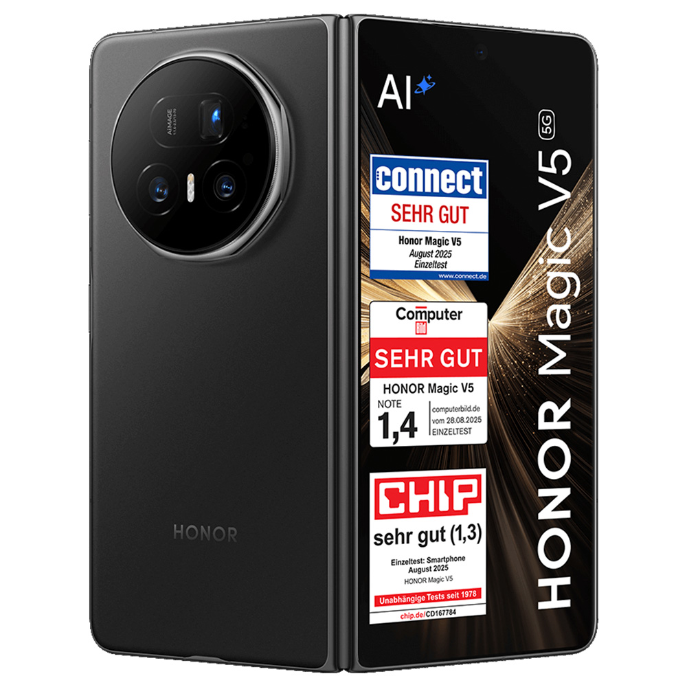 *Aktion gültig bis 30.09 bei Erwerb eines Honor Magic V5 in einem Magenta Handytarif (zB Mobile Unlimited um €69,90 mtl. Grundgebühr, 24 Monate Mindestvertragsdauer, zzgl. €6,60 Urheberrechtsabgabe). Abbildungen dienen zur Veranschaulichung. Der Gesamtwert (€299) des Bundles ergibt sich aus den Verkaufspreisen der Produkte auf https://www.honor.com/de sowie einer Schätzung für das Case. Der tatsächliche Marktwert kann variieren. Erhalt der HONOR Watch 5 sowie HONOR Magic-Pen nach der Registrierung unter: magenta.at/honor-registrierung bis 14.10.2025, solange der Vorrat reicht. HONOR TPU Case ist bereits im Lieferumfang enthalten. Kein Umtausch gegen Barablöse.